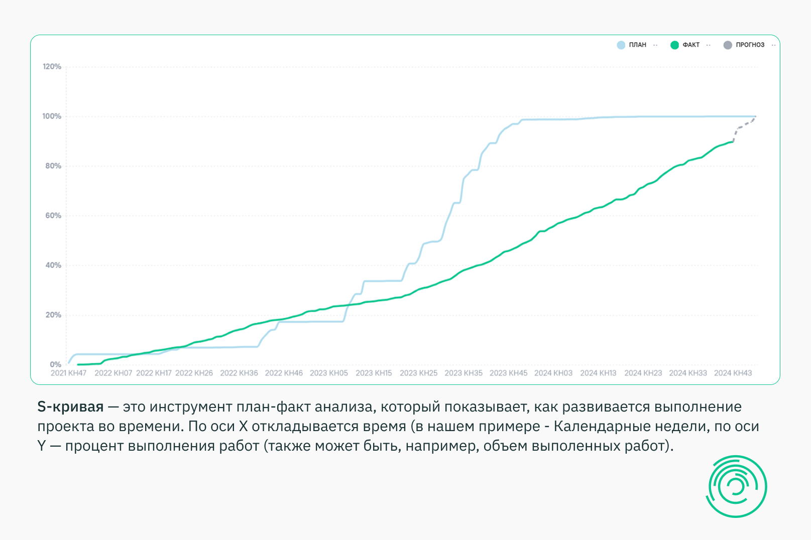 Такая визуализация позволяет увидеть не только текущее состояние проекта, но и динамику выполнения: в какой момент началось отставание и как оно развивается. Это делает S-кривую удобным инструментом для раннего выявления отклонений и принятия управленческих решений.
