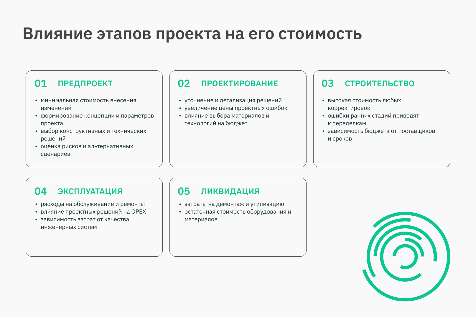 Интеграция управления стоимостью в жизненный цикл проекта — от ТЭО до эксплуатации — формирует устойчивую финансовую модель. Именно это обеспечивает прозрачность бюджета, снижает риск перерасхода и поддерживает инвестиционную привлекательность проекта.