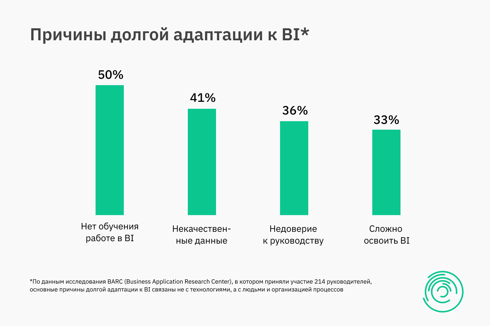 По данным исследования BARC (Business Application Research Center), в котором приняли участие 214 руководителей, основные причины долгой адаптации к BI связаны не с технологиями, а с людьми и организацией процессов.