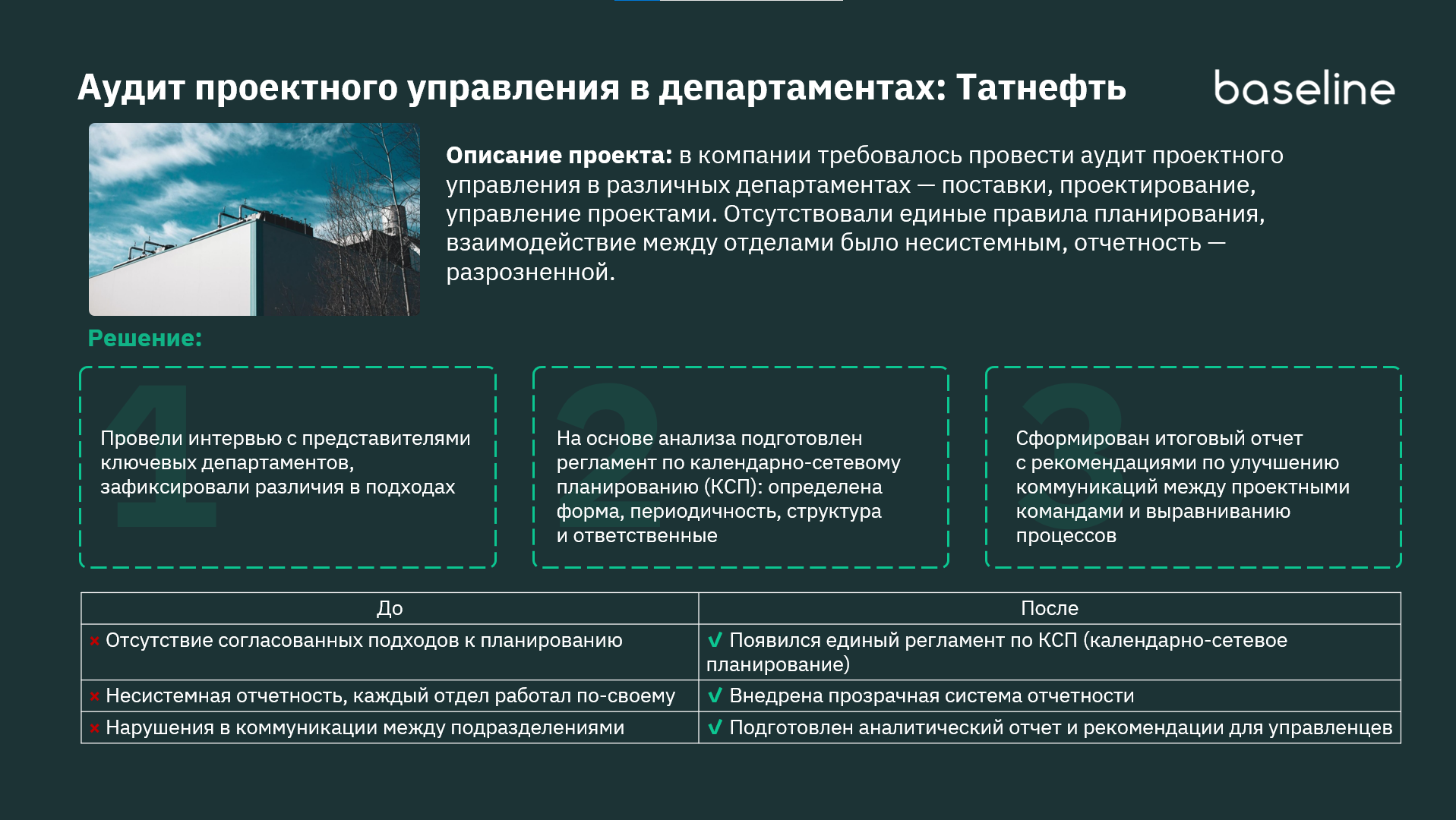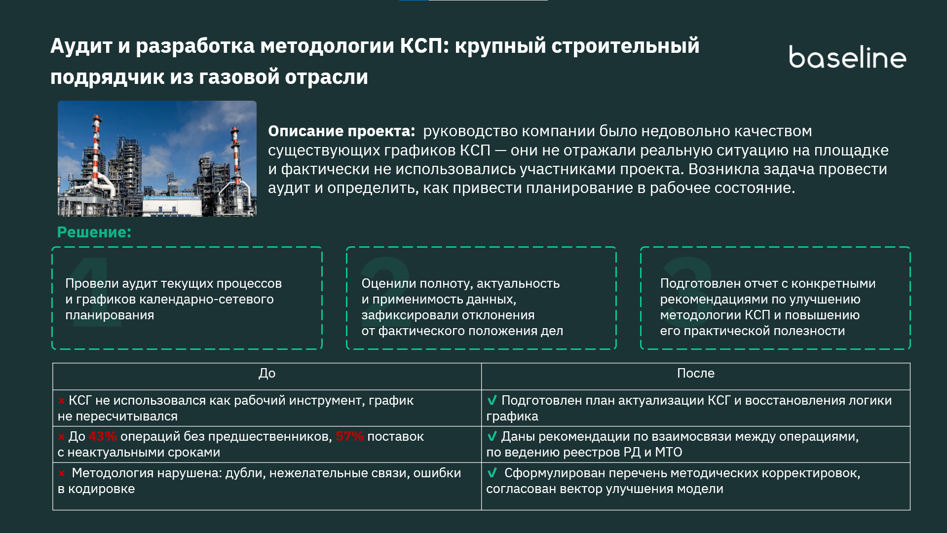 Отделы планировали по-разному: где-то в Excel, где-то в MS Project, без общей методологии. Аудит показал, что нет единого регламента и форматов. Мы выстроили КСП на уровне департаментов, ввели единый подход и визуализировали отчётность — это улучшило согласование и управление сроками.