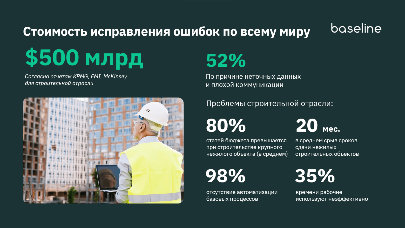 По данным McKinsey, FMI и KPMG, ежегодные потери строительной отрасли из-за неэффективности процессов достигают $500 млрд. Речь идёт не только о прямых убытках, но и об упущенных возможностях — от срывов сроков до сбоев в цепочках поставок и дублирования функций между подразделениями.
