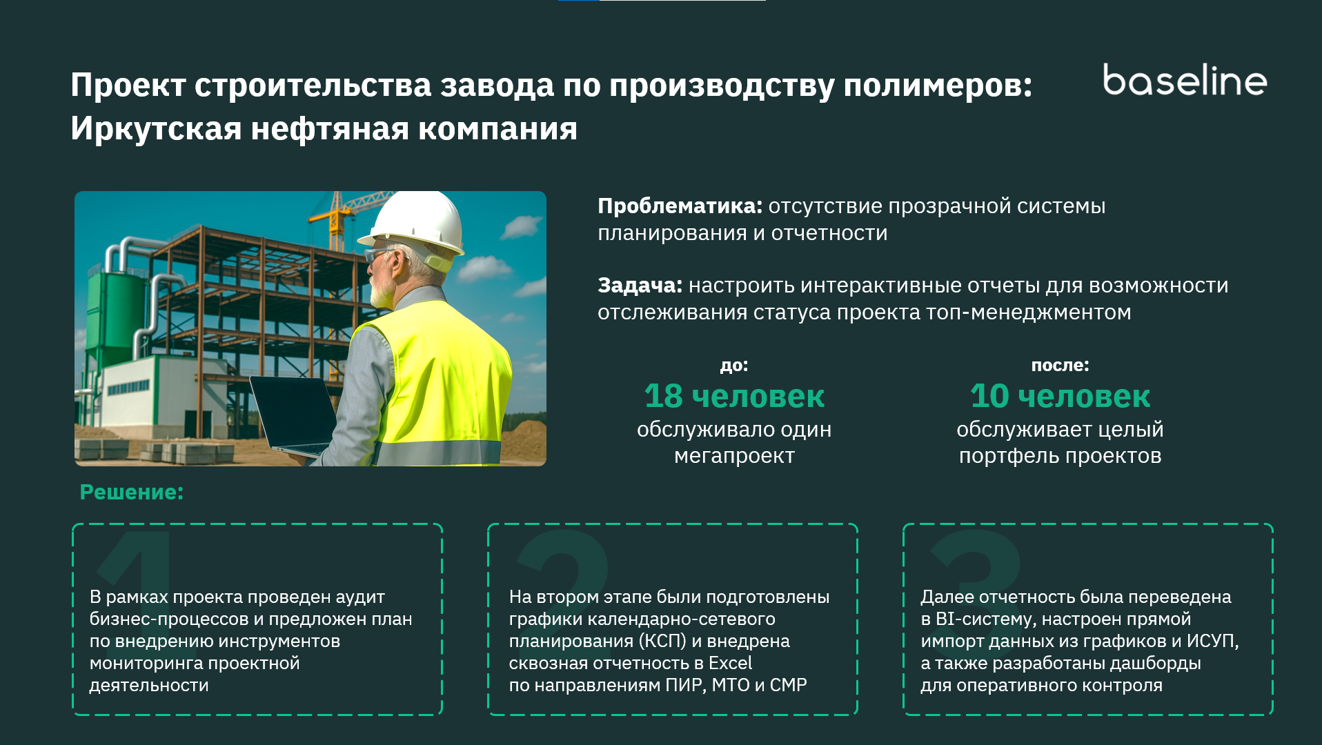 Проект обслуживали 18 человек, большинство задач закрывались вручную, отчётность формировалась «в Excel». После аудита и внедрения BI-системы удалось не только автоматизировать сбор и анализ данных, но и сократить команду до 10 человек без потери качества. Вся проектная деятельность теперь управляется через цифровые модели.